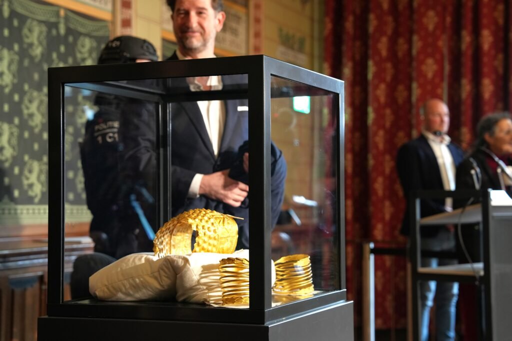 De gouden helm van Cotofenesi en twee van de drie gouden armbanden zijn terecht. De Roemeense pronkstukken die in januari vorig jaar uit het Drents Museum gestolen werden, werden vandaag op diezelfde plek in een persconferentie onthuld.
